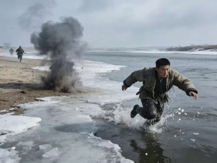 爆炸声在河滩上炸响,气浪掀起了冲在最前边的两个敌兵,其他东说念主也慌忙趴下。就在这良晌的散乱中,何姜泉冲向河面,选中一处冰层较薄的场所,一头扑了进去!