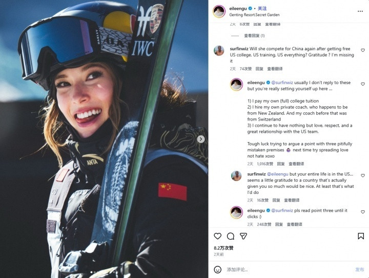 享受好意思国福利却代表中国? 被批不懂感德后, 谷爱凌霸气怒怼番邦网友